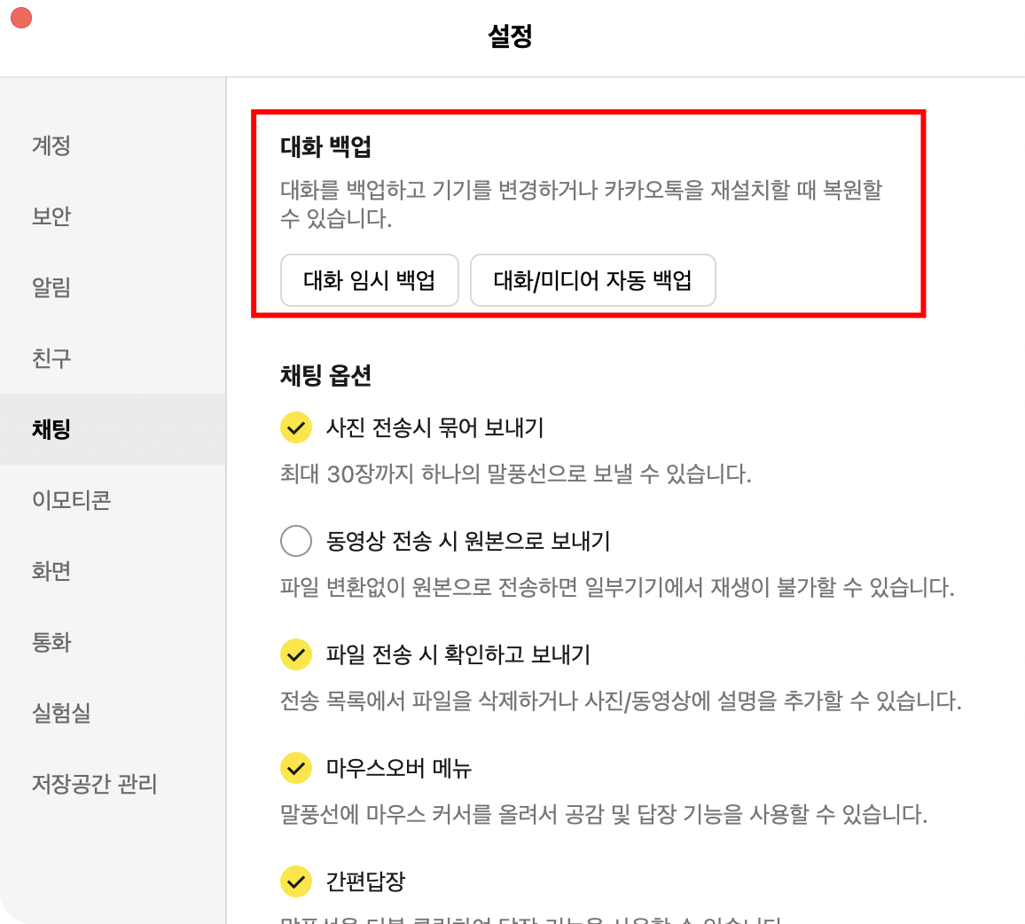- 채팅 > 대화 백업 선택
