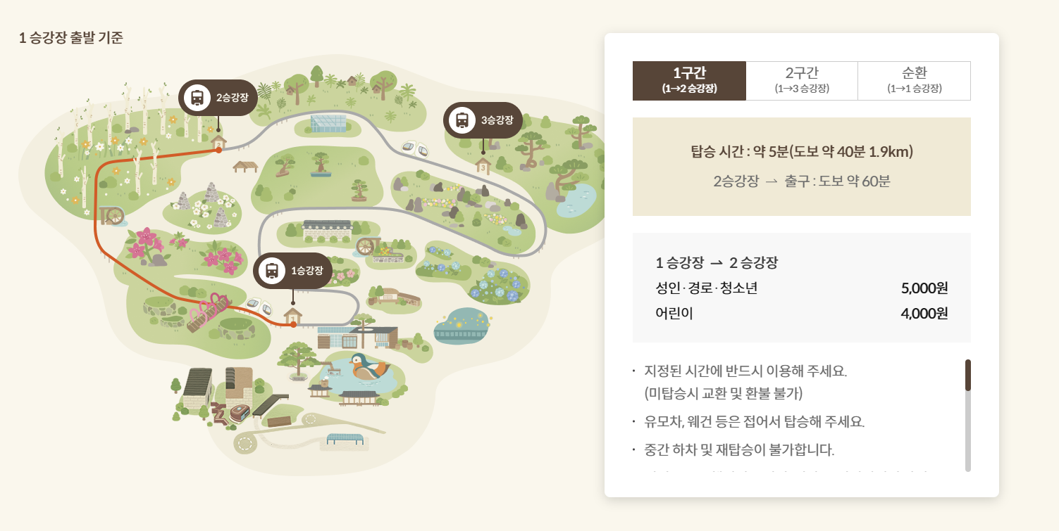 - 운행 구간: 입구에서 주요 정원 전망대까지 연결