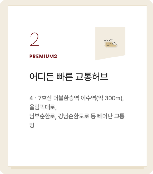 - 교통: 이수역(4·7호선) 도보 약 10분 거리. 강남·강북 접근성 모두 뛰어남.
