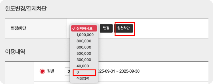 - 한도변경/결제차단 → 0원 설정 또는 원천 차단 진행