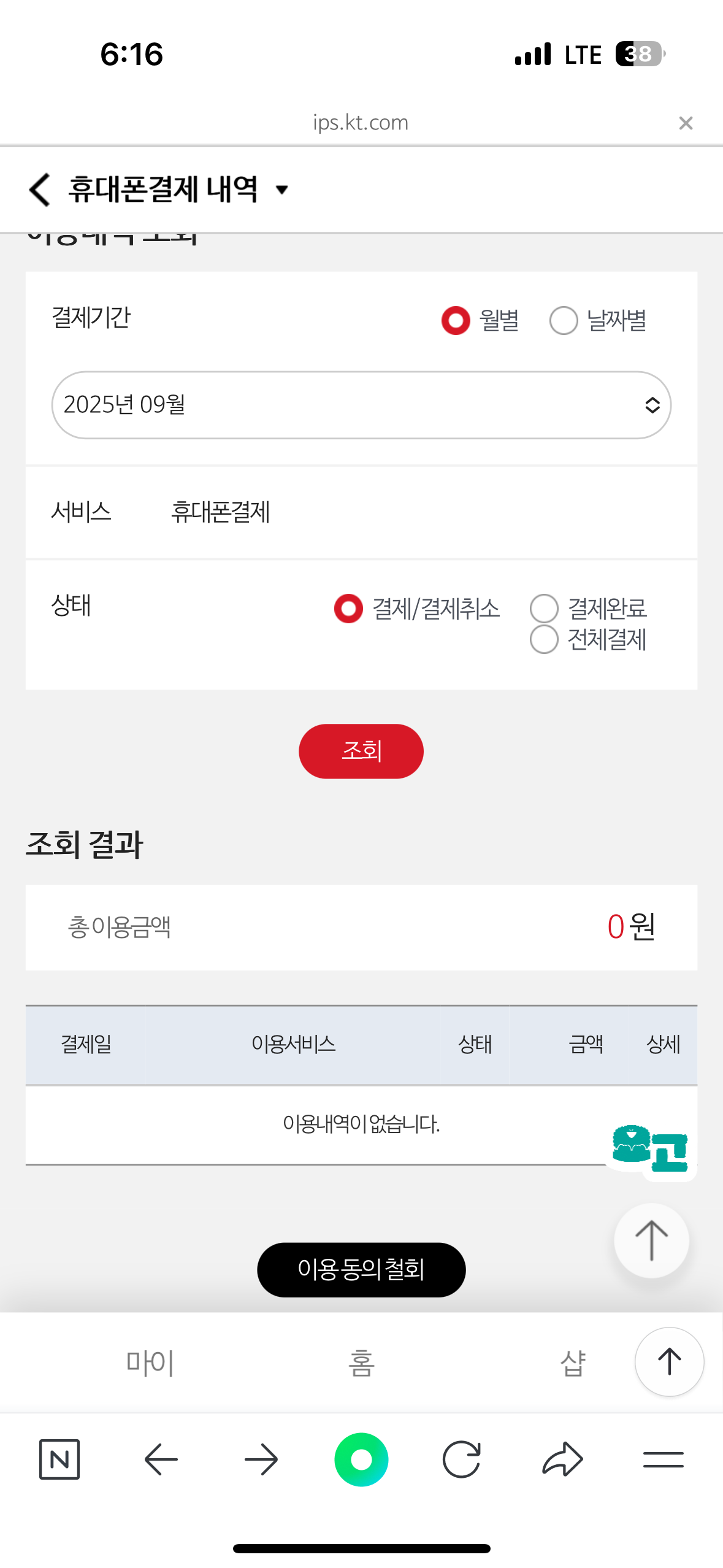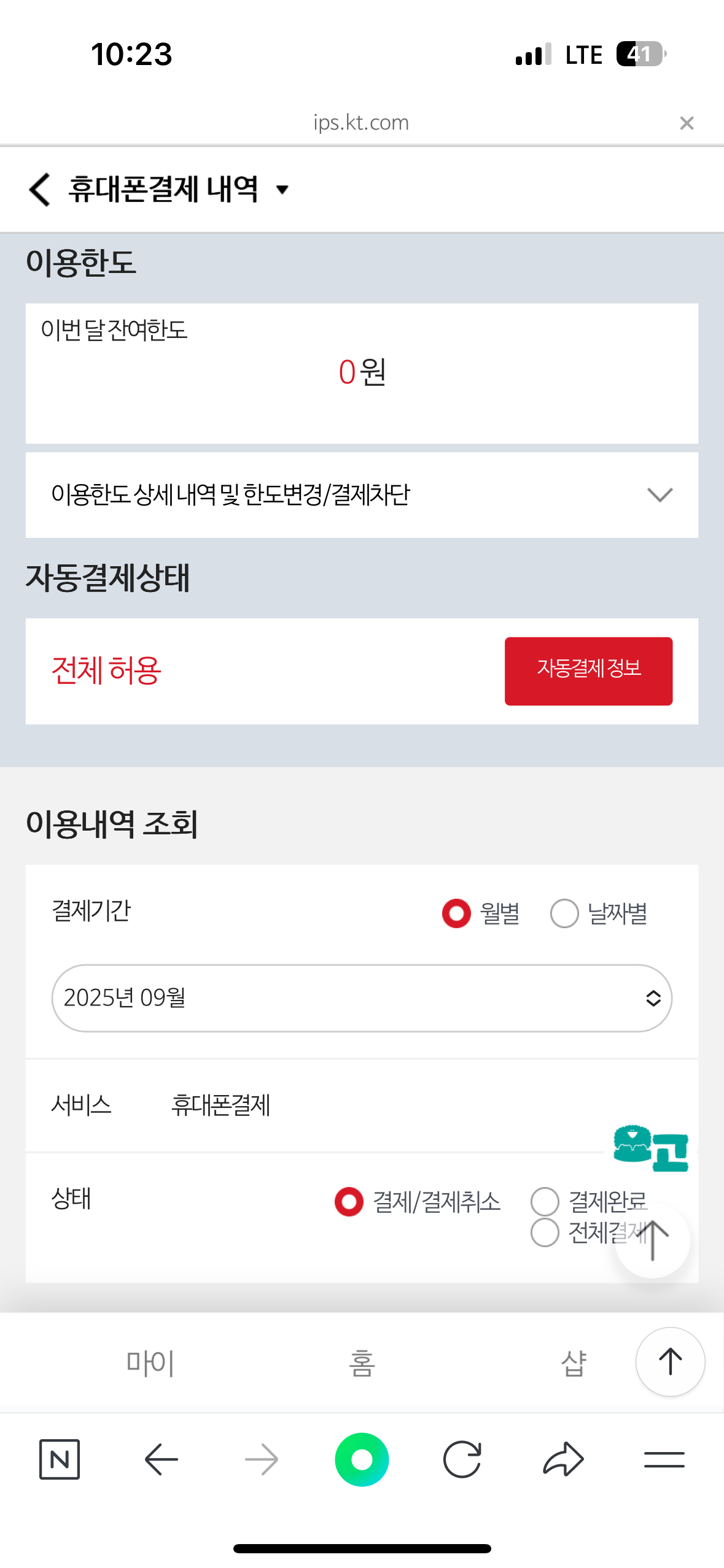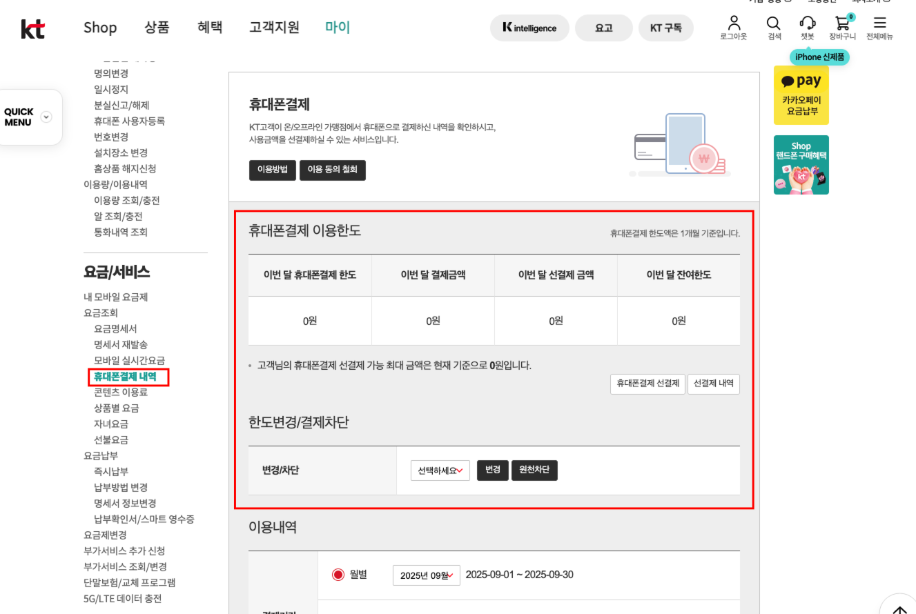 - 요금/서비스 → 휴대폰결제 내역