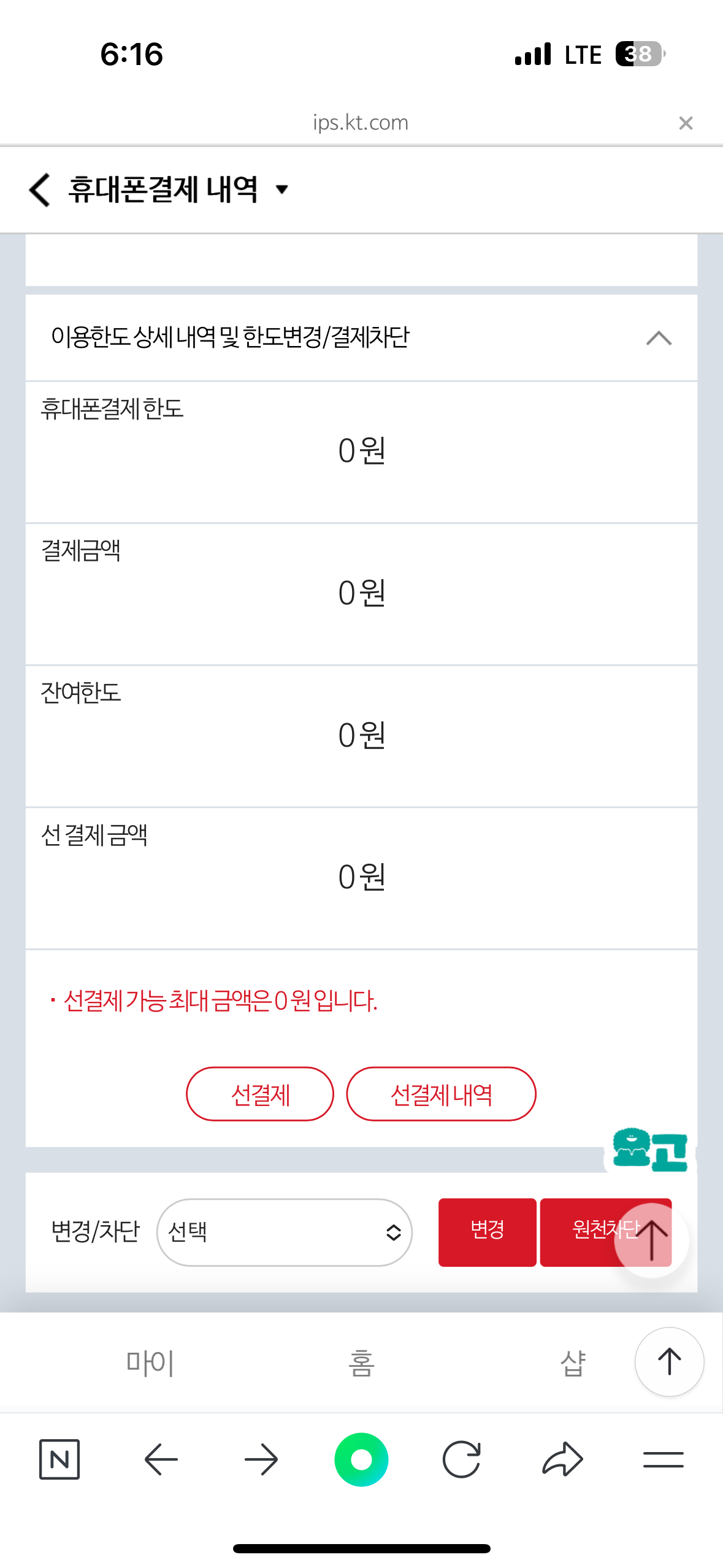 - 소액결제 차단 → ON 으로 변경
